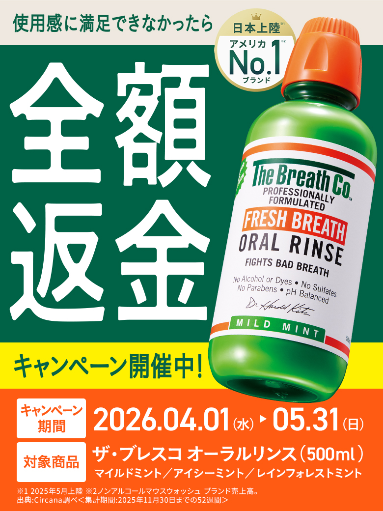 ザ・ブレスコ オーラルリンス500mlをご購入いただいた方を対象に、商品にご満足いただけなかった場合に限り、返品および返金を受け付けるキャンペーンです。レシートなどの購入証明と申請用紙、購入日の翌日から14日以内の商品を事務局宛にお送りいただいたお客様に、購入代金分のAmazonギフト券をお送りします。(以下、「返金」と表現します。)店頭での返品は一切受け付けておりません。