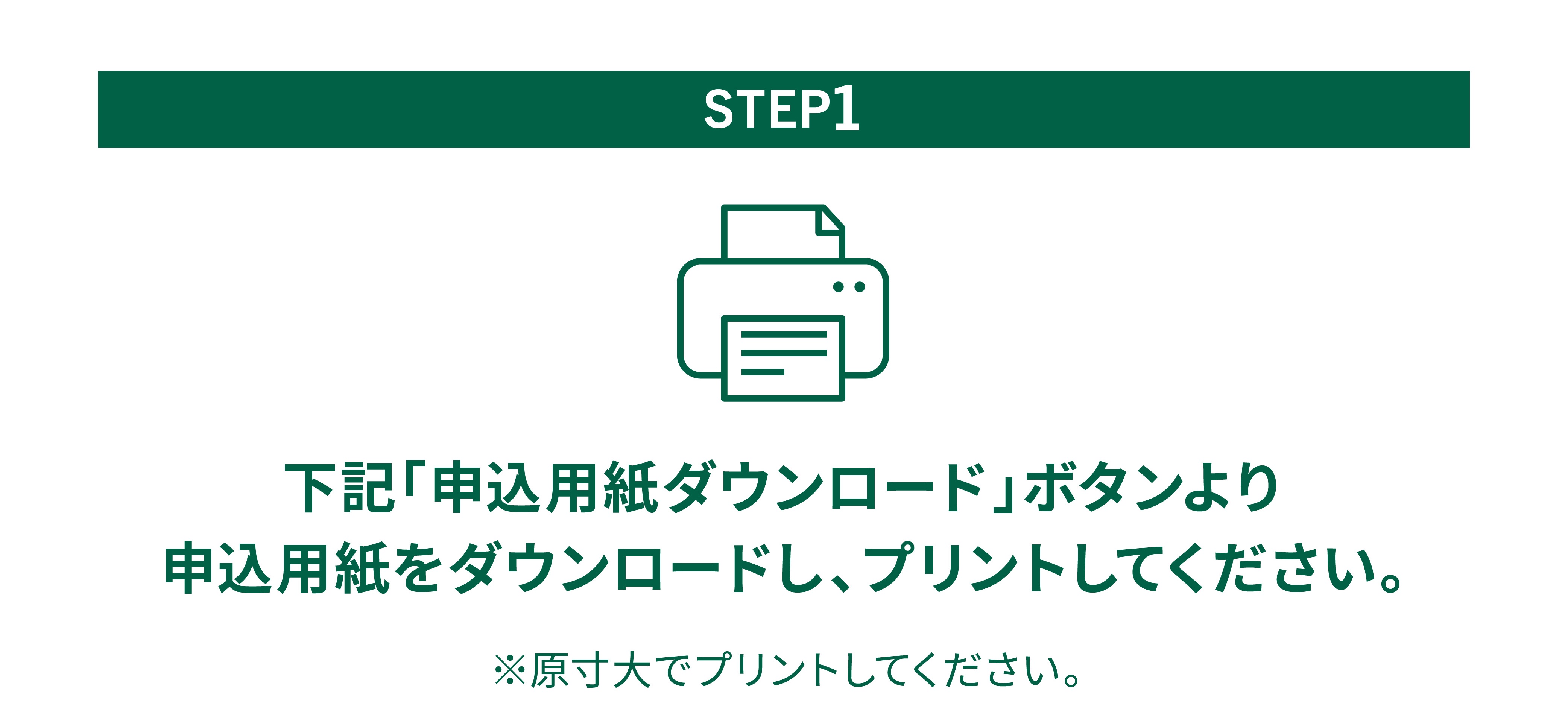 「申込用紙ダウンロード」ボタンより申込用紙をダウンロードしてください。※原寸大でプリントしてください。