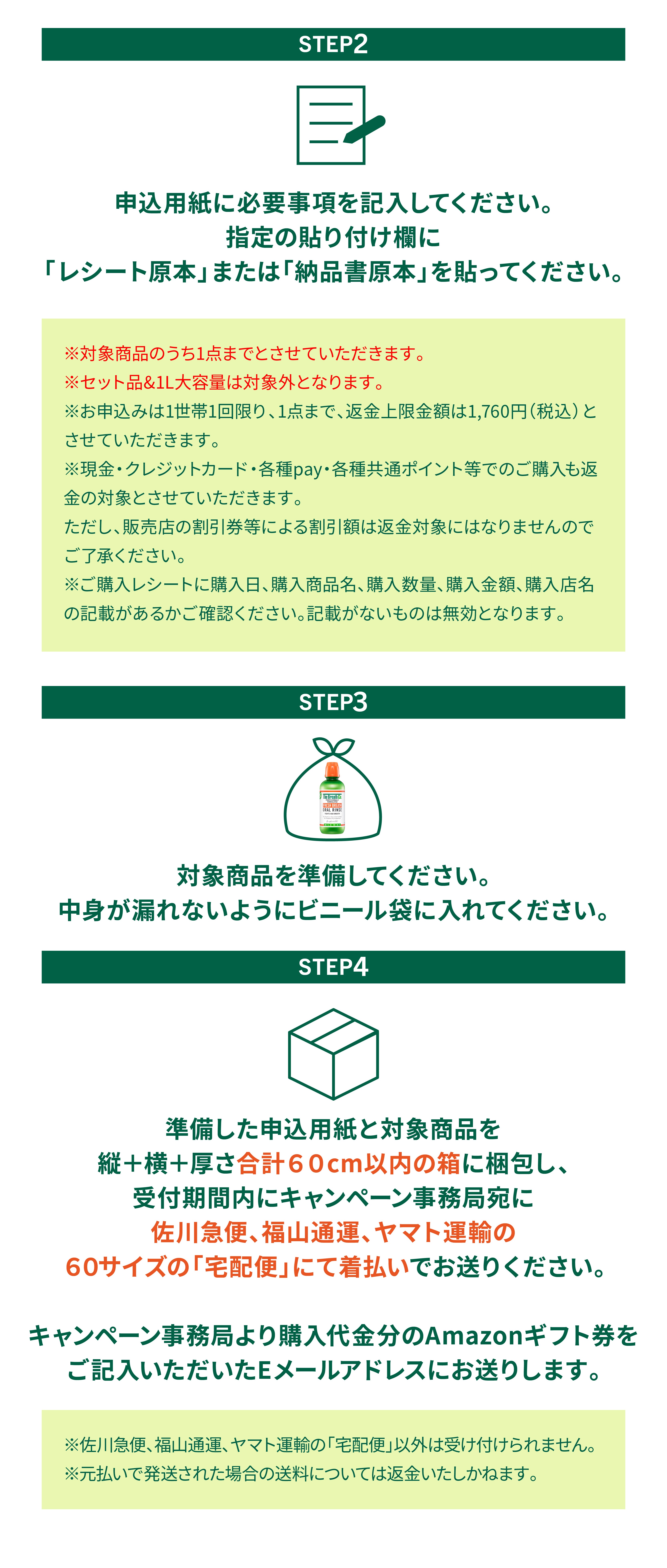 準備した申込用紙と対象商品を縦+横+厚さ合計60cm以内のサイズの箱に梱包し、受付期間内にキャンペーン事務局宛に佐川急便、福山通運、ヤマト運輸の60サイズの「宅配便」にて着払いでお送りください。キャンペーン事務局より購入代金分のAmazonギフト券をご記入いただいたEメールアドレスにお送りします。- ※佐川急便、福山通運、ヤマト運輸の「宅配便」以外は受け付けられません。